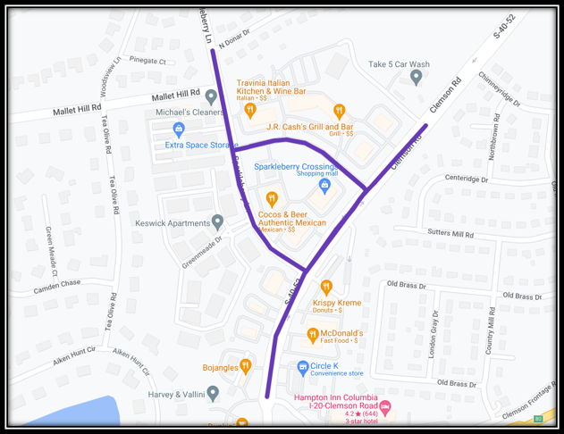 The proposed scope recommends improvements to the Clemson Road and Sparkleberry Lane intersection to increase intersection capacity. The project limits along Clemson Road begin at the Corporate Park Drive/Frontage Road Intersection and end at Sparkleberry Crossing Road intersection and the limits along Sparkleberry Lane begin at Clemson Road and end at Mallet Hill Drive.