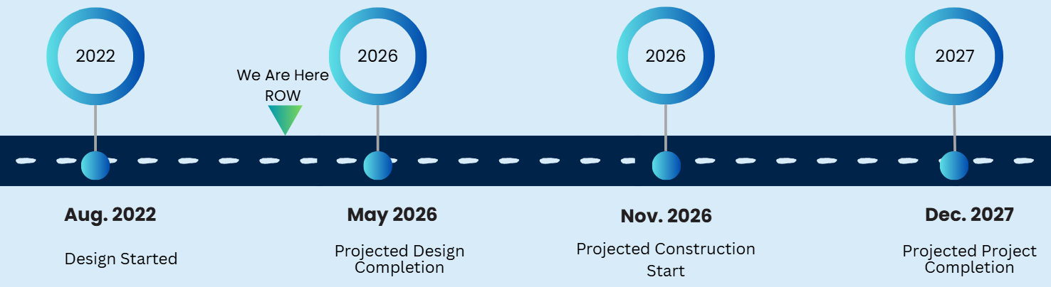 - Construction plans are approximately 63% complete, continue coordination to reach final submittal. ROW staking has been completed.