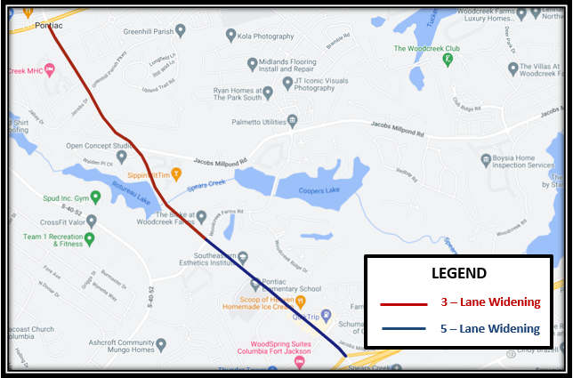 The project will consist of potential improvements along the existing roadway from North of the intersection with Two Notch Road (US 1) and just before the westbound I-20 entrance/exit ramps, for a total length of approximately 2.3 miles. From Two Notch Rd to Earth Rd is 3‐lane, from Earth Rd to I‐20 is 5‐lane.